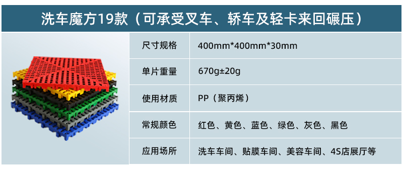 正和19款洗車魔方是正和公司2019年推出的新品,該產(chǎn)品厚度為30毫米,采用更為粗壯的加強筋和更為寬大的面層設(shè)計,是目前載重、抗沖擊效果最好的產(chǎn)品。