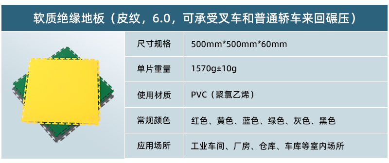 5、高承載,更防滑: 軟質(zhì)絕緣地板為實心結構,只要地面承重沒有問題,其承載能力能夠達到每平米10噸以上。地板表面在生產(chǎn)過程中帶有凸起的紋路,讓車間地面更為防滑。